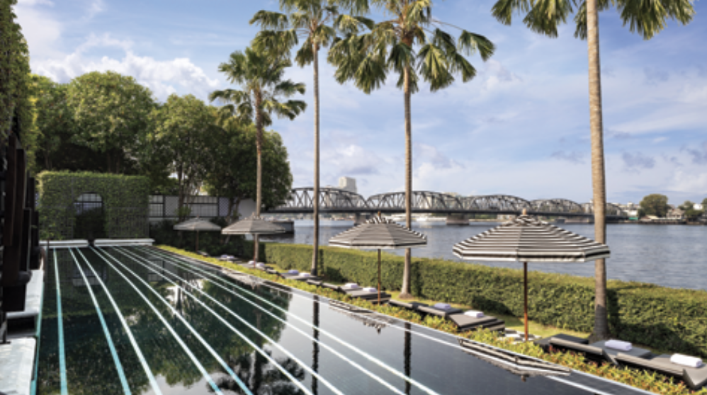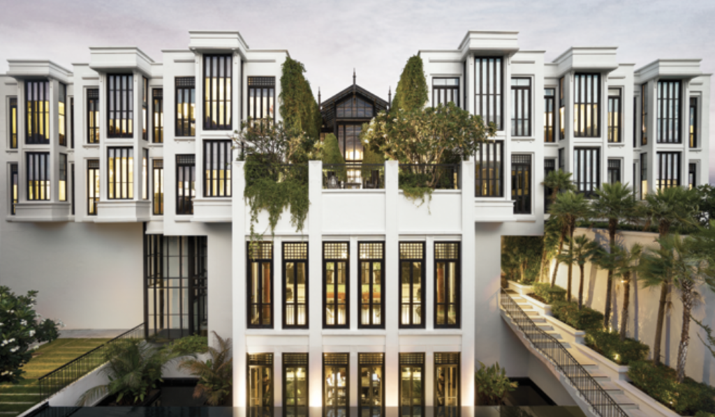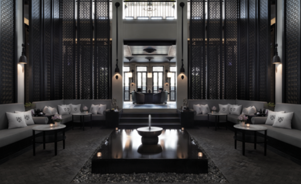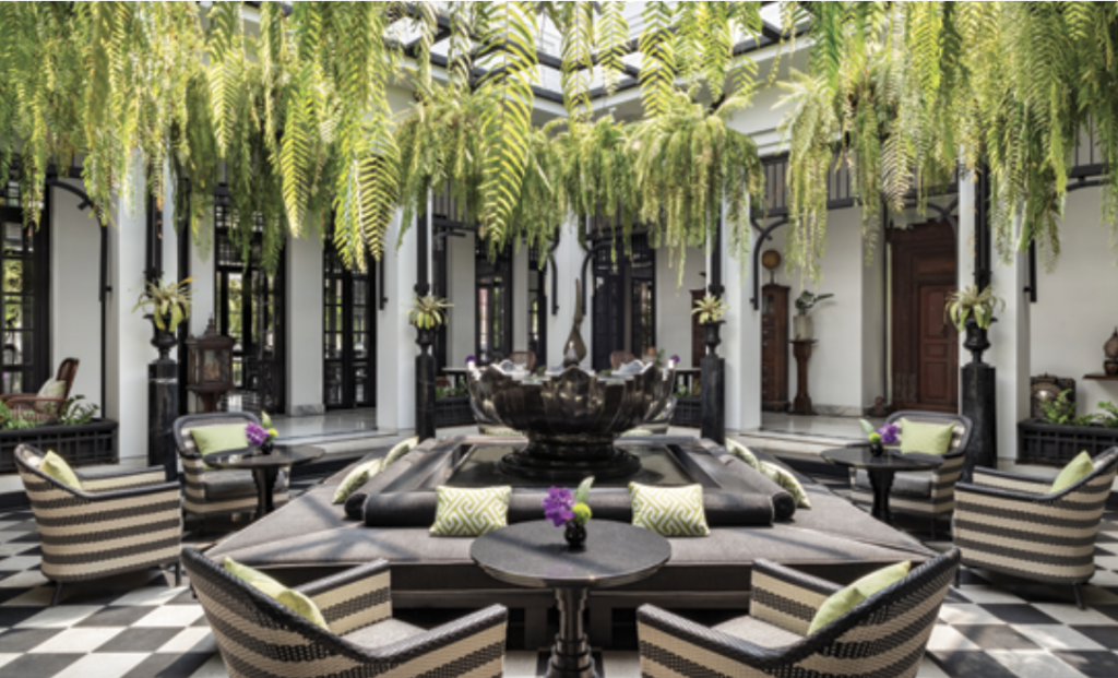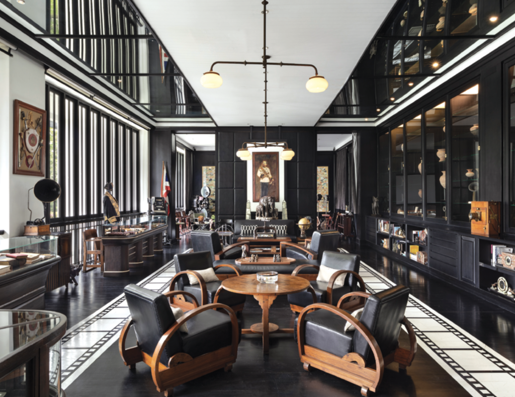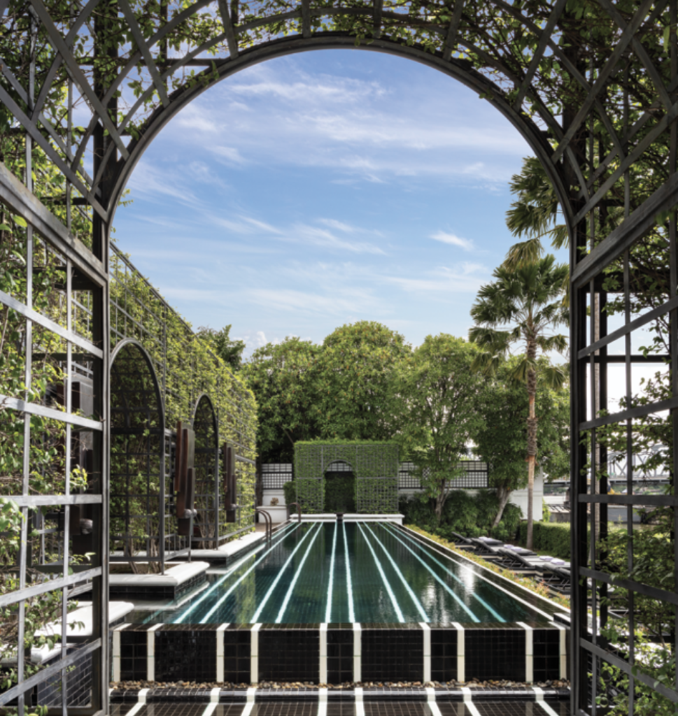 The moment I stepped into lobby, I knew I was in love. The space, with its striking juxtaposition of ebony and ivory, felt timeless and elegant—a nod to Bangkok’s greatest era, that of Rama V, with touches of Art Deco elements. Following that captivating entrance, I was gently guided to my seat. A refreshing gesture awaited: a cool, verbena-scented towel and a refreshing welcome drink of passionfruit and coconut. This simple, thoughtful greeting spoke volumes: Here, every detail is curated with care. The journey through the gorgeous black and white marble-floored lobby courtyard and the soaring atrium was seamless and serene. Towering traveler palms and lush ferns flanked an indoor water feature that blended with a mild color palette of creams and silver, while mixed natural materials were incorporated throughout the hotel’s grounds, suites, and signature restaurants.